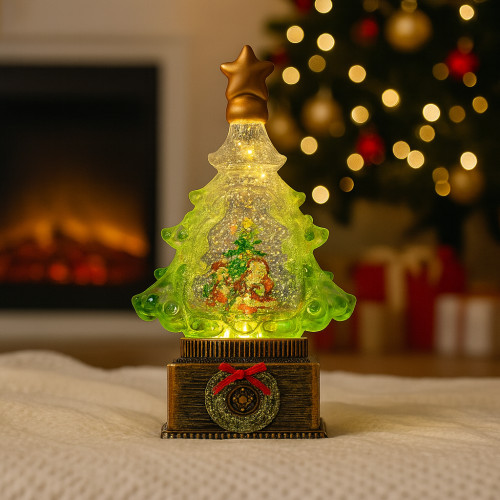 Погрузитесь в атмосферу настоящего рождественского чуда с этим уникальным светильником-декором! Это не просто "снежный шар", а целая сказочная композиция, выполненная в виде нарядной елки на винтажной бронзовой подставке.