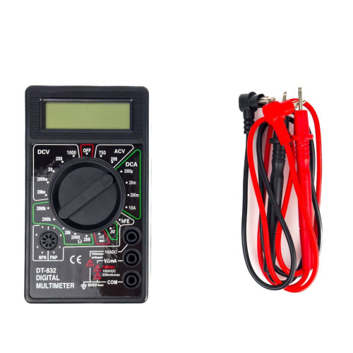 Тестер мультиметр цифровий Digital DT-832 є універсальним пристроєм, за допомогою якого можна виміряти напругу, силу струму і опір в електричному ланцюгу і на окремих її вузлах. Також за допомогою цифрового мультиметра DT-832 можна продзвонити напівпровідникові діоди та заміри посилення біполярних транзисторів. Якість з'єднання пайки або провідників перевіряється за допомогою звукового дзвінка. Оснащений генератором прямокутних імпульсів. Має окремий роз'єм вимірювання коефіцієнта передачі транзистора. Має пластиковий корпус. Елементи розташовані на передній частині та мають класичне розташування. Поворотний перемикач режимів вимірювання має чіткий хід із фіксацією в потрібному положенні. Прилад працює на батареях 9В типу "Крона". Усі межі захищені від перевантажень. Прилад допомагає встановити причину несправності техніки або виміряти параметри електроприладу.