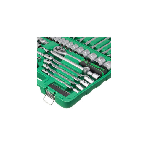 Набор состоит из 77 единиц с рабочими квадратами 1/2" и 1/4", практичен и надежен в эксплуатации. Все насадки изготовлены из высокопрочного хром-ванадиевого сплава, что обеспечивает высокие эксплуатационные характеристики, а также защиту от коррозии. Набор укомплектован в удобный пластиковый кейс.Наличие большого набора рожково-накидных, шарнирных и Г-образных ключей, двух ключей-трещоток, торцевых головок и разнообразных отверточных бит делает набор очень универсальным и позволяет осуществлять практически любые ремонтные работы не только дома, но и в гараже или мастерской. Благодаря строгому соблюдению технологии производства, весь инструмент характеризуются точностью и отсутствием дефектов. Шарнирные ключи: 8-15 мм; Габаритные размеры: 395х295х80 мм; Размер рожково-накидных ключей: 7-19 мм; Квадрат: 1/2"1/4"; Количество единиц в наборе: 77 ед.; Материал чемодана: пластик