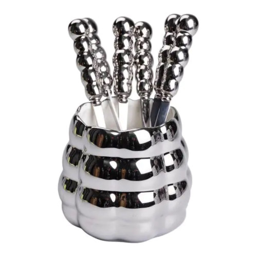 Набор десертных вилок и ложек состоит из приборов, изготовленных из нержавеющей стали, с керамическими ручками, оформленными в виде жемчужин. Сочетание материалов обеспечивает прочность изделий и эстетичный вид. Гладкая поверхность стали способствует удобному использованию и легкому уходу. Основные характеристики: Количество предметов в наборе: 7 шт.; Количество персон: 3; Материал приборов: нержавеющая сталь, фарфор; Материал подставки: фарфор; Упаковка: коробка; Размеры: высота подставки: 7 см; длина десертной ложки: 14.5 см; длина десертной вилки: 14.5 см. Форма ложек и вилок адаптирована для употребления десертов, обеспечивая комфорт во время трапезы. фарфоровые ручки имеют гладкую структуру, что придает приборам характерный внешний вид. Конструкция ручек предусматривает надежное сцепление с металлической частью, что минимизирует риск повреждений во время эксплуатации. Набор дополнен фарфоровой подставкой, которая служит для удобного хранения приборов. Подставка соответствует общему дизайну комплекта и обеспечивает организованное размещение предметов на столе или в зоне сервировки.