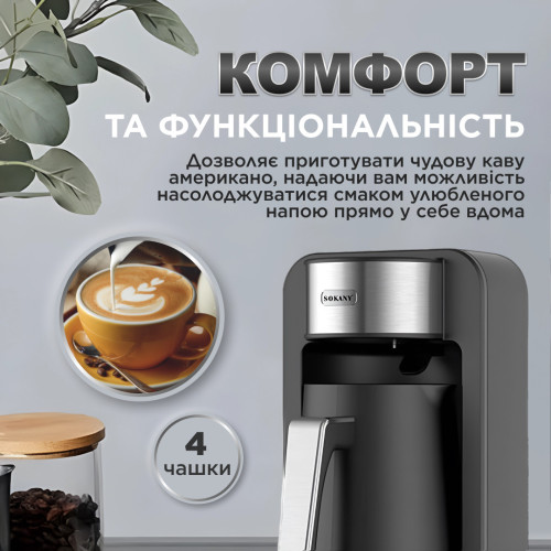 Настоящий аромат кофе Погружайтесь в мир непревзойденного аромата кофе с кофеваркой Sokany SK-0137. С мощностью 550 Вт и ёмкостью 250 мл, эта кофеварка станет вашим надёжным помощником в создании идеального напитка каждый раз. Нержавеющая сталь емкости не вступает в реакцию с напитками и не меняет их вкус. Аромат на каждый день Sokany SK-0137 раскрывает тончайший аромат вашего любимого напитка. Благодаря эффективной системе заваривания, каждая капля кофе насыщена вкусом и ароматом, чтобы вы получали только лучшее. Простота и удобство Компактный и эргономичный дизайн делает Sokany SK-0137 идеальной для любой кухни. Лёгкая в использовании и уходе, эта кофеварка быстро станет вашим лучшим другом в утренних ритуалах.